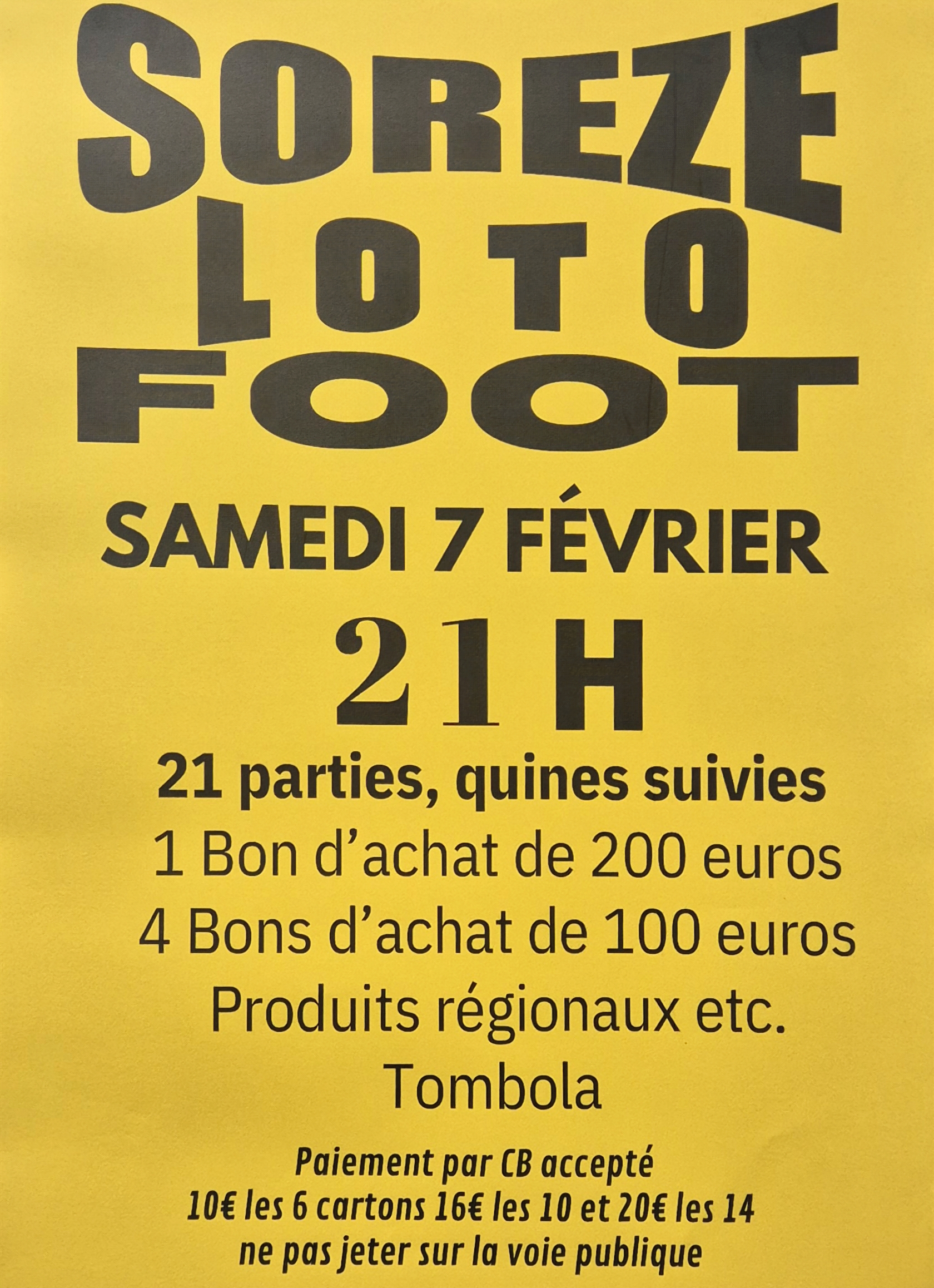 Salle des fêtes Georges de Léotoing avenue de Castres, Sorèze, FranceLoto du foot samedi 7 février 2026 dès 21h00, à la salle des fêtes "Georges de Léotoing". Nombreux lots à gagner ! La mairie décline toute responsabilité en cas d'annulation.